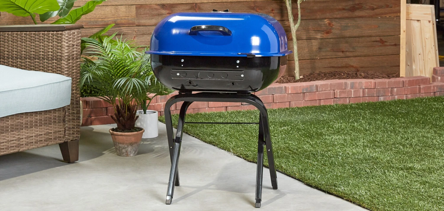 Have a barbecue party in the park with this Aussie Kettle 21.25-in charcoal grill. Its chrome-plated steel cooking grate offers 332 Sq. In. of cooking area to evenly distribute heat while preventing flare-ups while grilling burgers, hot dogs, pork chops, chicken and fish. The stay-cool hood handle helps prevent burns while grilling, and the hanging hook conveniently allows you to keep cooking utensils within reach. Retractable legs allow for easy transport and storage so hauling it to the pool or park is hassle-free and the ocean blue lid brings a stylish element no matter where you find yourself grilling. The adjustable hood and bowl vent offers greater temperature control and the easy-clean ash removal system allows for fast mess-free cleanup. This grill is already completely pre-assembled so you can start grilling immediately.