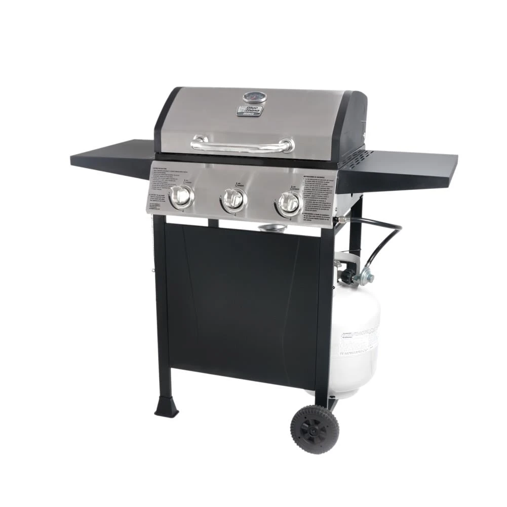 The Blue Rhino 3 burner stainless steel gas grill features three stainless steel burners for a total of 27000-BTU of power. Cook up to 25 burgers at a time. A push and turn ignition makes this grill easy to light and simple to use. Side shelves offer extra space. The wheels make transporting easy for your next event.