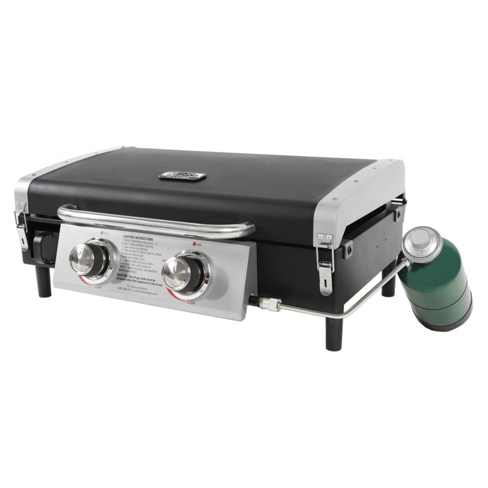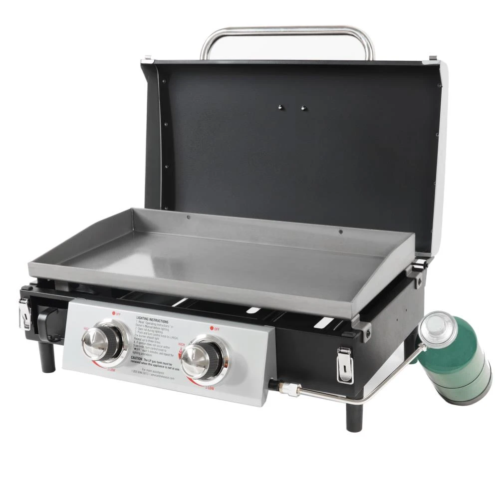 The Blue Rhino® 2 burner portable Razor griddle grill has plenty of room to cook all your favorite foods; perfect for backyard barbecues, camping and tailgating. Outdoor griddle made for BBQ cookout weekends with friends and family all summer long. Cook up to 21 burgers at a time, fry up some eggs, sizzle some bacon or even do stir fry…all with the versatile Razor griddle grill. 2 stainless steel tube burners with 20,000 BTUs with easy push and turn ignition. Large capacity, 318 sq in pre-seasoned griddle. Secure front access drain and cup for easy grease disposal. Versatile surface for cooking breakfast, lunch and dinner. Steel lid protects and shelters your savory meal from unexpected, incoming weather while steaming foods or melting cheeses. Use 1-lb liquid propane cylinder (not included).