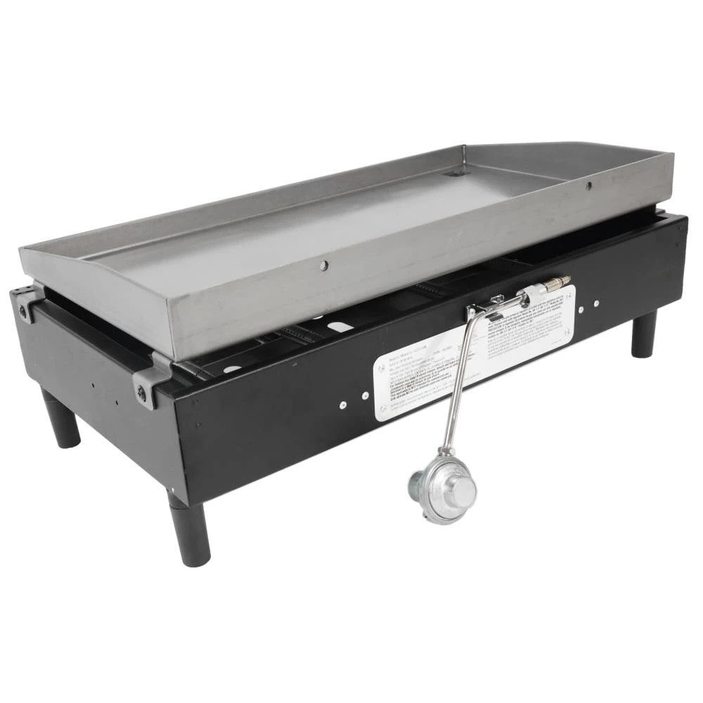 The Blue Rhino® 2 burner portable Razor griddle grill has plenty of room to cook all your favorite foods; perfect for backyard barbecues, camping and tailgating. Outdoor griddle made for BBQ cookout weekends with friends and family all summer long. Cook up to 21 burgers at a time, fry up some eggs, sizzle some bacon or even do stir fry…all with the versatile Razor griddle grill. 2 stainless steel tube burners with 20,000 BTUs with easy push and turn ignition. Large capacity, 318 sq in pre-seasoned griddle. Secure front access drain and cup for easy grease disposal. Versatile surface for cooking breakfast, lunch and dinner. Use 1-lb liquid propane cylinder (not included).