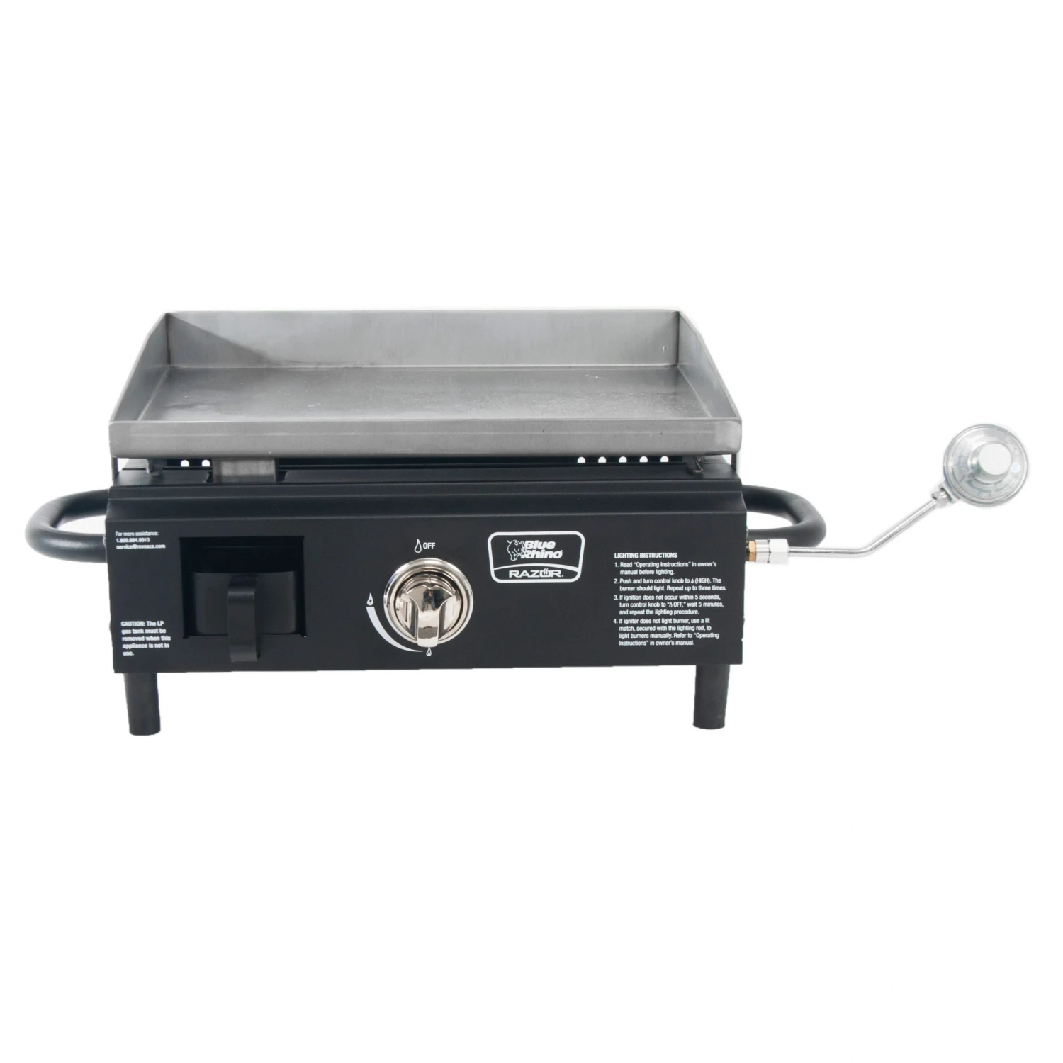 Cook up to 20 burgers at a time, fry up some eggs, sizzle some bacon or even do stir fry…all with the versatile Razor™ portable griddle grill by Blue Rhino®. Perfect for camping, tailgating or your backyard, the Razor™ features a large stainless steel burner for a total of 18000-BTU of power. A push and turn ignition makes this grill easy to light and simple to use. Clean up is a snap and no spills with the unique grease management system and concealed cup. Two handles allow for quick and easy transport to your next cookout.