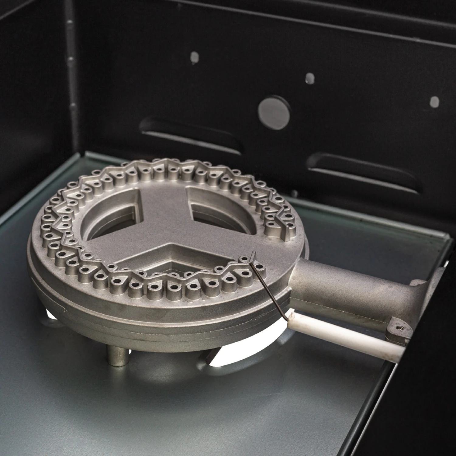 - 3 Cast aluminum burners produce 90,000 total BTUs