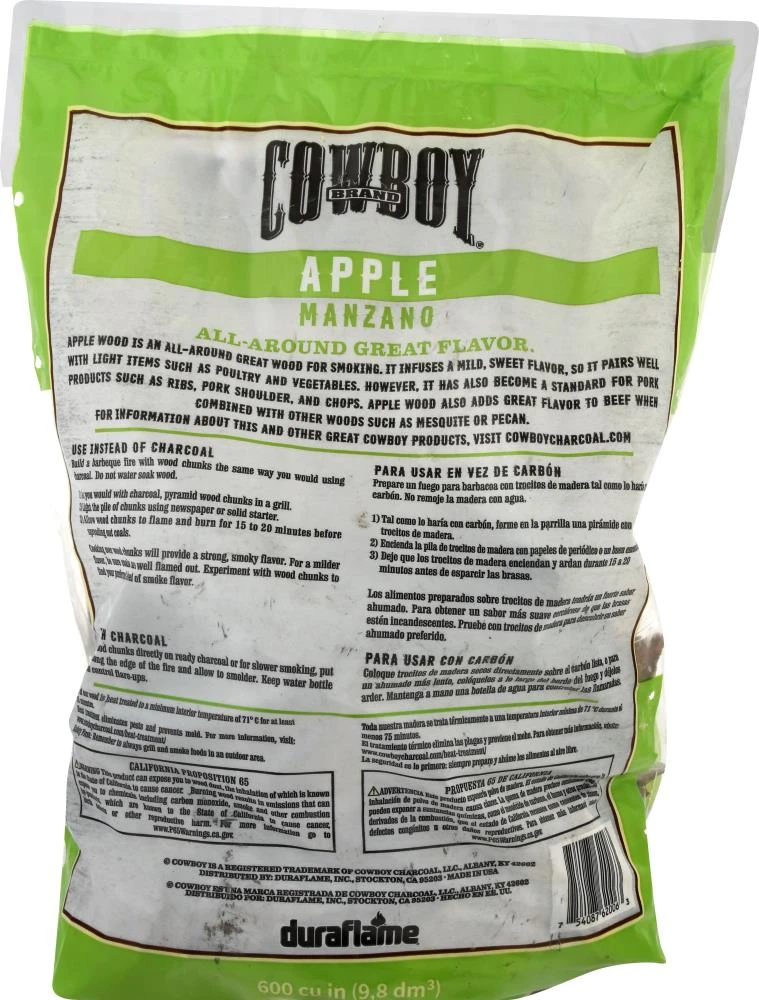 Discover what chefs across the world already know about the distinct and fruity flavor that Cowboy Apple wood chips provide to the most popular and rarest meats. The crisp, sweet Apple aroma from the rich Apple woods of the Midwest will enhance any grilling experience. Cowboy Apple wood chips are a healthy, zero calorie, no-sodium and nonfat way to flavor foods. Use in charcoal or gas grills.